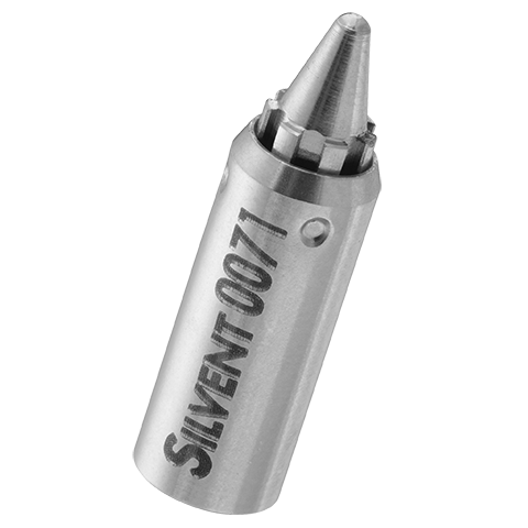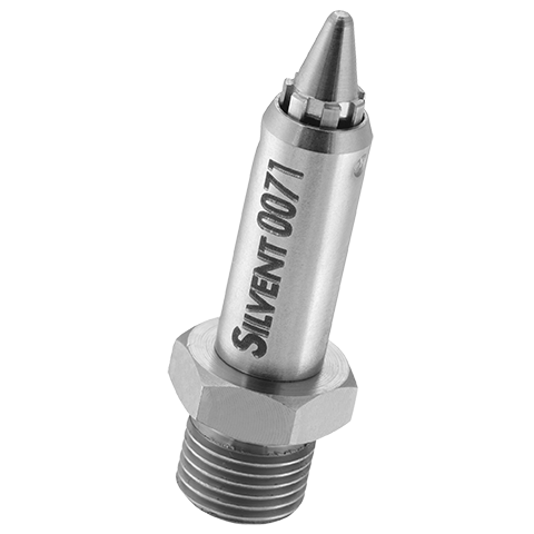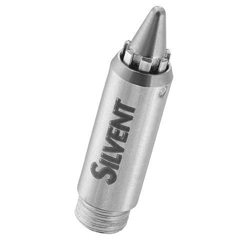 SILVENT 011: a robust stainless steel nozzle. Stainless steel is necessary in applications involving e.g. high ambient temperatures, the food processing industry, or intensive mechanical nozzle wear. Noise level is halved and energy savings are considerable in comparison with "open pipe blowing".